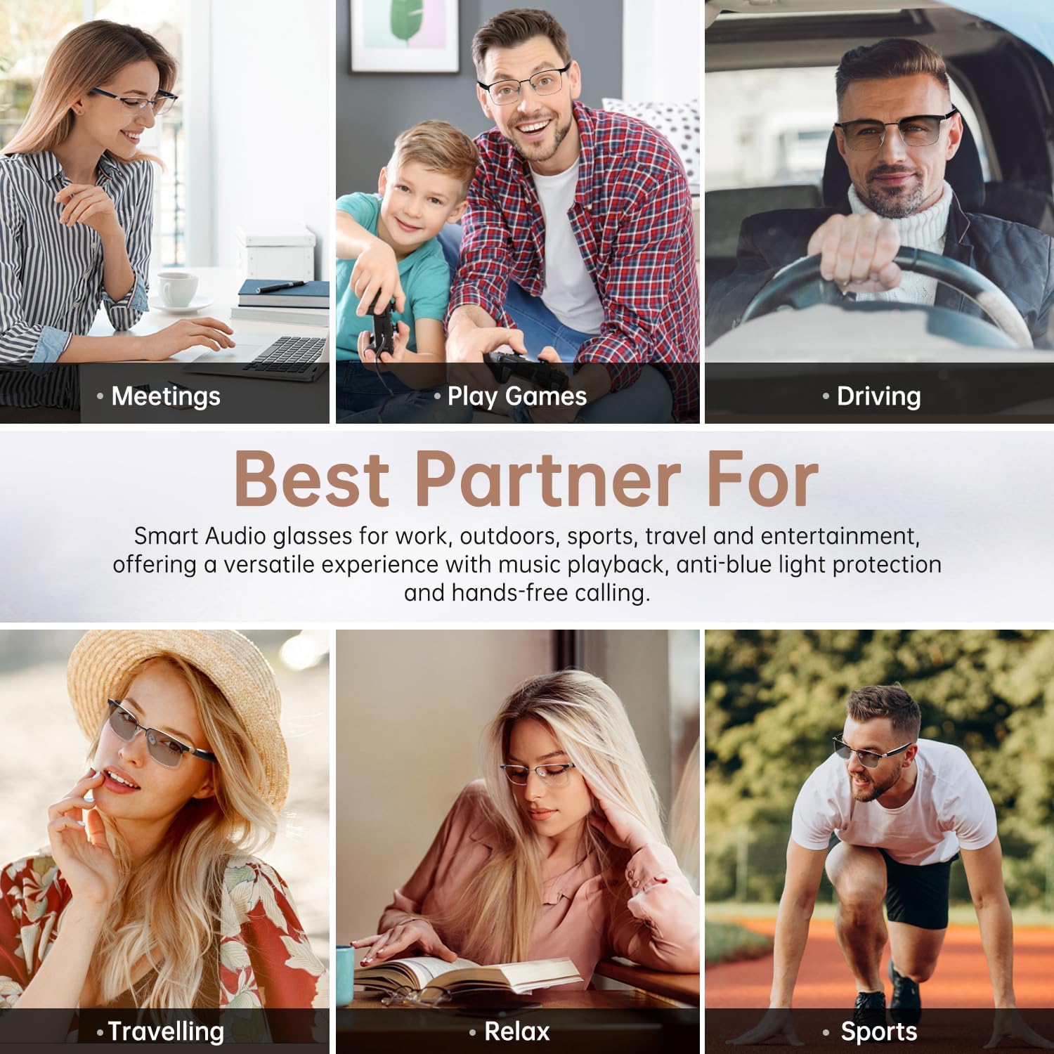 - 【Open-ear Headphones Glasses】: Our bluetooth glasses are designed with open dual speakers, using independent audio decoder chip + AAC speaker technology to ensure sound quality and high quality sound for calls, the clear sound quality gives you a different open-ended experience.