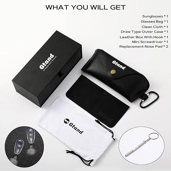 - WHAT YOU WILL GET - 1.Sunglasses*1 - 2.Drawer type outer case*1 - 3.Leather box with portable hook*1 - 4.Black clean cloth*1 - 5.Glasses Bag*1 - 6.Mini screwdriver*1 - 7.Replacement Nose Pad*2. These exquisite gift ideas package will be wonderful gifts for your family and friends!